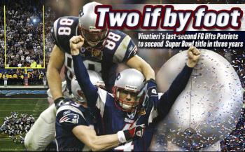 Was für ein Superbowl ! Eine quälend langweilige erste Halbzeit, 2 verschossene Fieldgoals vom sonst so sicheren Patriots-Kicker Adam Vinatieri. Dann 24 Punkte in 3 Minuten. Die (un?)freiwillige Brustentblößung von Janet Jackson. Der Flitzer auf dem Feld kurz nach der Halbzeit, der von Panthers-LB Mat Catham getackelt wurde. Die Fernsehkameras die deswegen weggeschwenkt wurden. Oooooh Amerika ! Wieder Football auf dem Platz. Wieder ein langweiliges Quarter. Dann das Finale. Spannung bis zum Schluß, das beste Mittel um den Mitteleuropäer um 04:30 Uhr morgens wachzuhalten: 37 Punkte im 4.Quarter. Superbowlrekord. Geniale Pässe von Panthers-QB Jake Delhomme. Ausgleich zwei Minuten vor Schluß. Alle Zeichen stehen auf Overtime. Tom Brady unbeindruckt. Bewegt sein Team Meter für Meter nach vorne. 8 Sekunden vor Schluß: Timeout. Fieldgoal. Adam Vinatieri. It's good. It' over ! Ein geiler Superbowl !